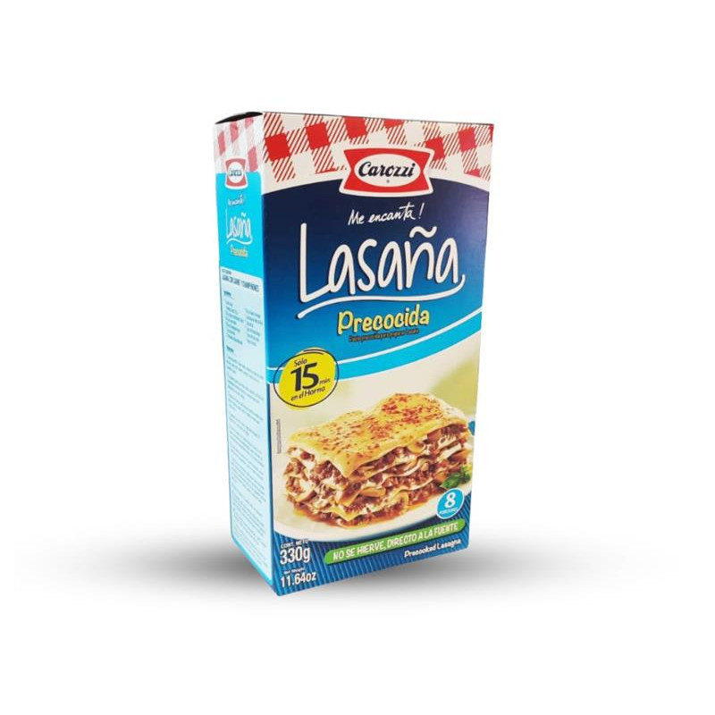 Lasagna precocida Carozzi en presentación de 330 gramos. Ideal para preparar de manera rápida y sencilla lasaña casera, este producto garantiza una cocción perfecta y una textura al dente, listo para ser utilizado en diversas recetas de pasta gratinada con salsa y queso.